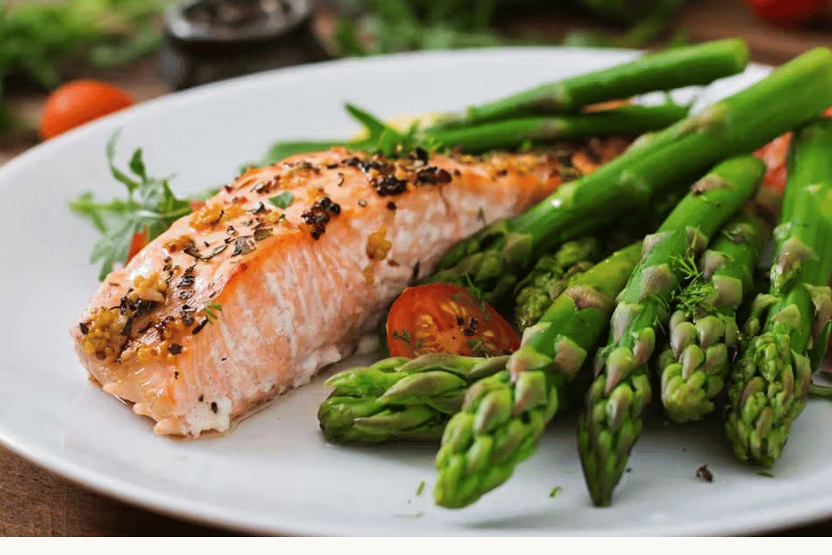 Baked salmon served alongside steamed broccoli florets then cooked keto bites keto acv gummies cauliflower rice (plenty of proteins, healthy fats as well as non starchy vegetables rich in fiber but having fewer digestible carbs)